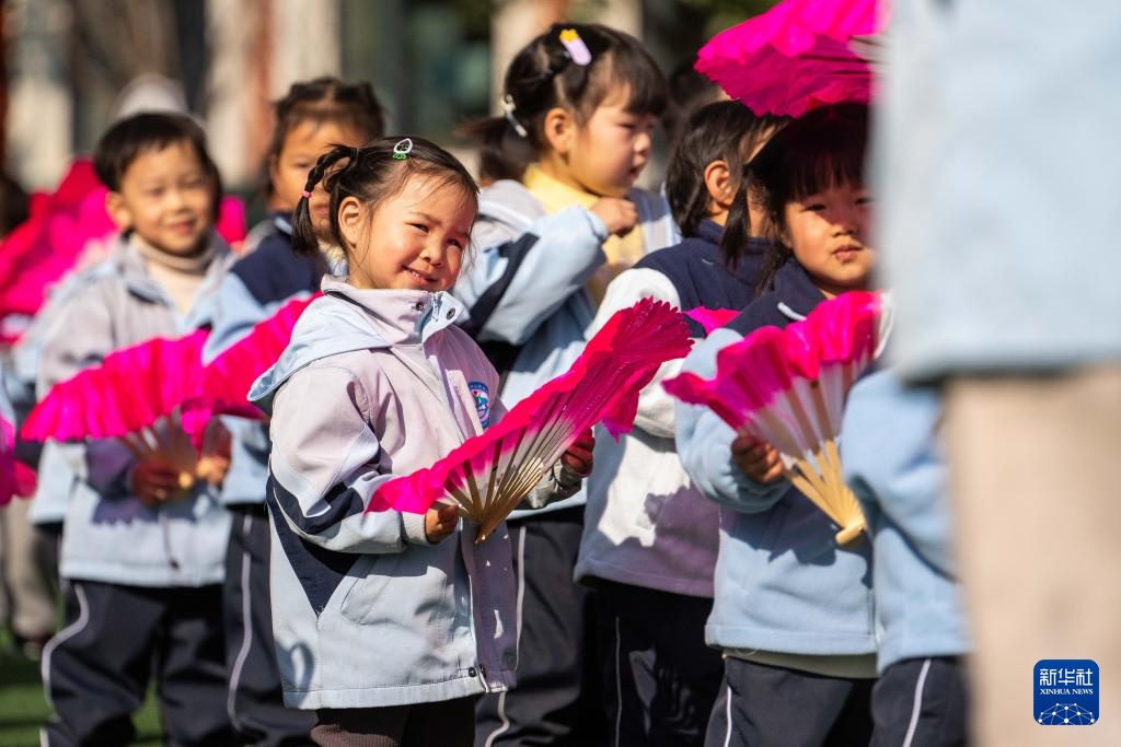 1月13日,在南县第三实验幼儿园,学生在课间练习南县地花鼓。新华社记者 周勉 摄